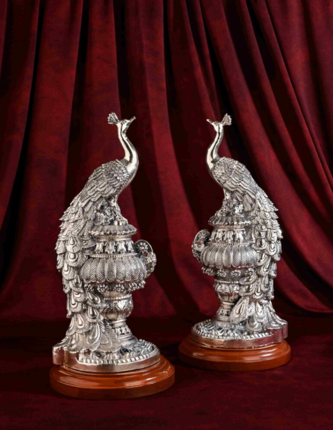 Handcrafted Silver Peacock Figurine on Lotus Base